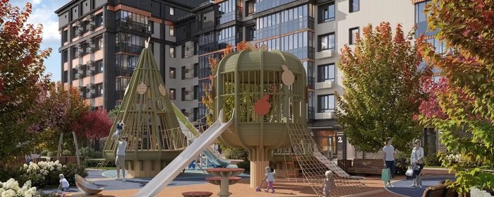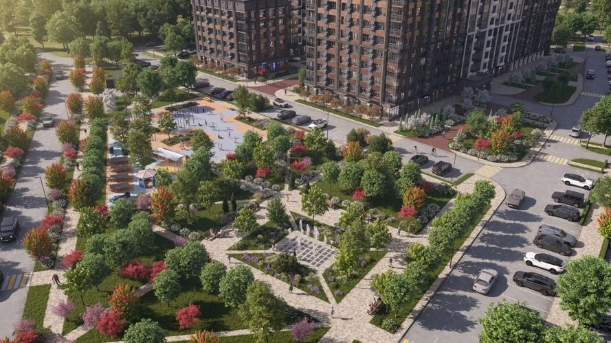 Свободные от машин озелененные дворы обеспечивают безопасность и комфорт на свежем воздухе. Современные спортивные и игровые пространства, а также изящный фонтан с уютными зонами для отдыха насыщают атмосферу комплекса.